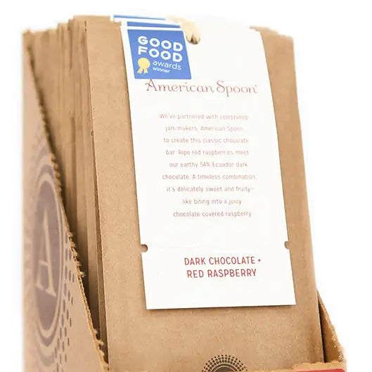 An elevated take on a classic combo, we created this bright and fruity bar in partnership with award-winning jam makers, American Spoon. We handcraft this 54% dark chocolate with cocoa beans we source directly from farmers in san jose del Tambo, Ecuador, and blend with organic, velvety red raspberries and a pinch of turbinado sugar. The result is comforting and classic--like biting into a juicy chocolate-covered raspberry. Not only do we love American Spoon’s fruit jams and preserves, but our companies also share many similarities. We’re both good food award-winners and family businesses with a passion for making honest food that tastes great. This bar is a result of those efforts and is as tasty as it is timeless. This rich chocolate is certified kosher D.E., vegan, and gluten-free.