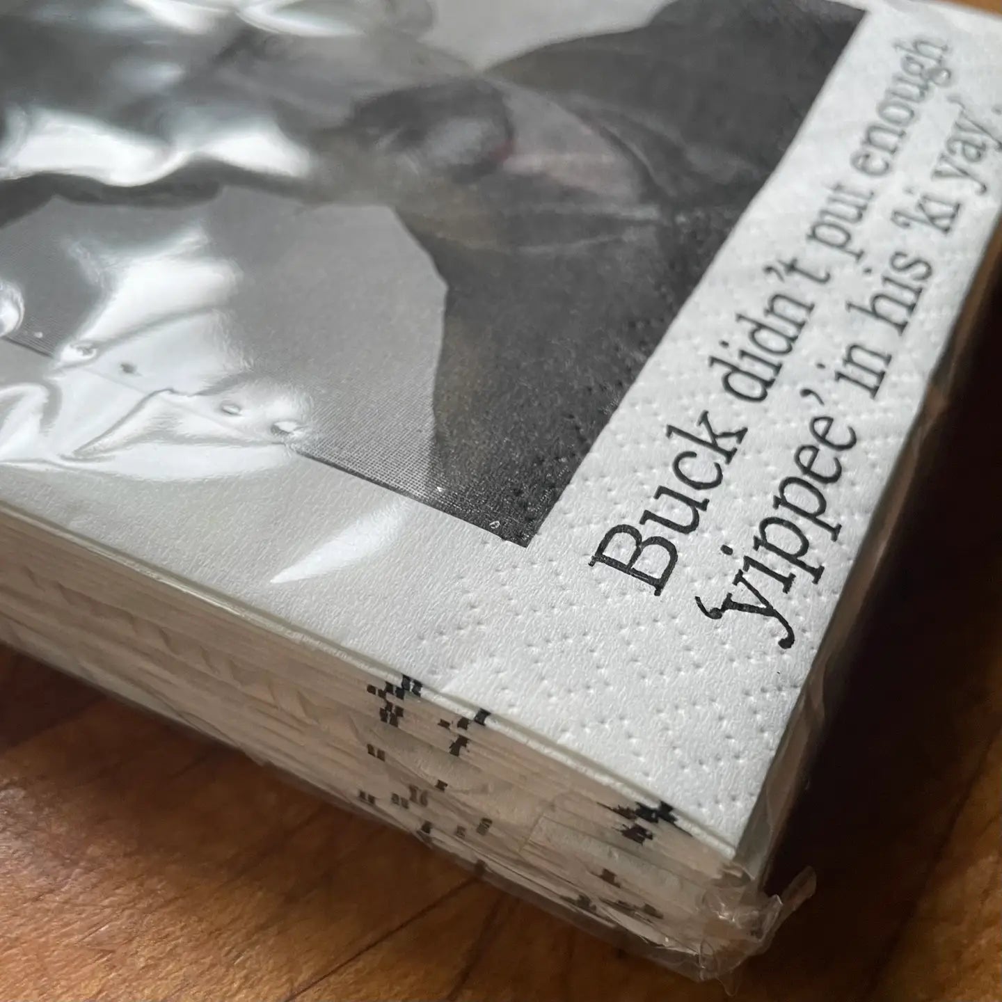 All the snarkiness and sassiness of our Big House mugshot line, now on a cocktail napkins. These beauties come in a cellophane wrapped pack of 20 3 ply napkins (because we're fancy like that). Standard cocktail napkin size, 9 7/8" x 9 7/8". Front image is the mugshot and sassiness, the inside and back are wrapped in prison barbed wire. And Made in the USA.