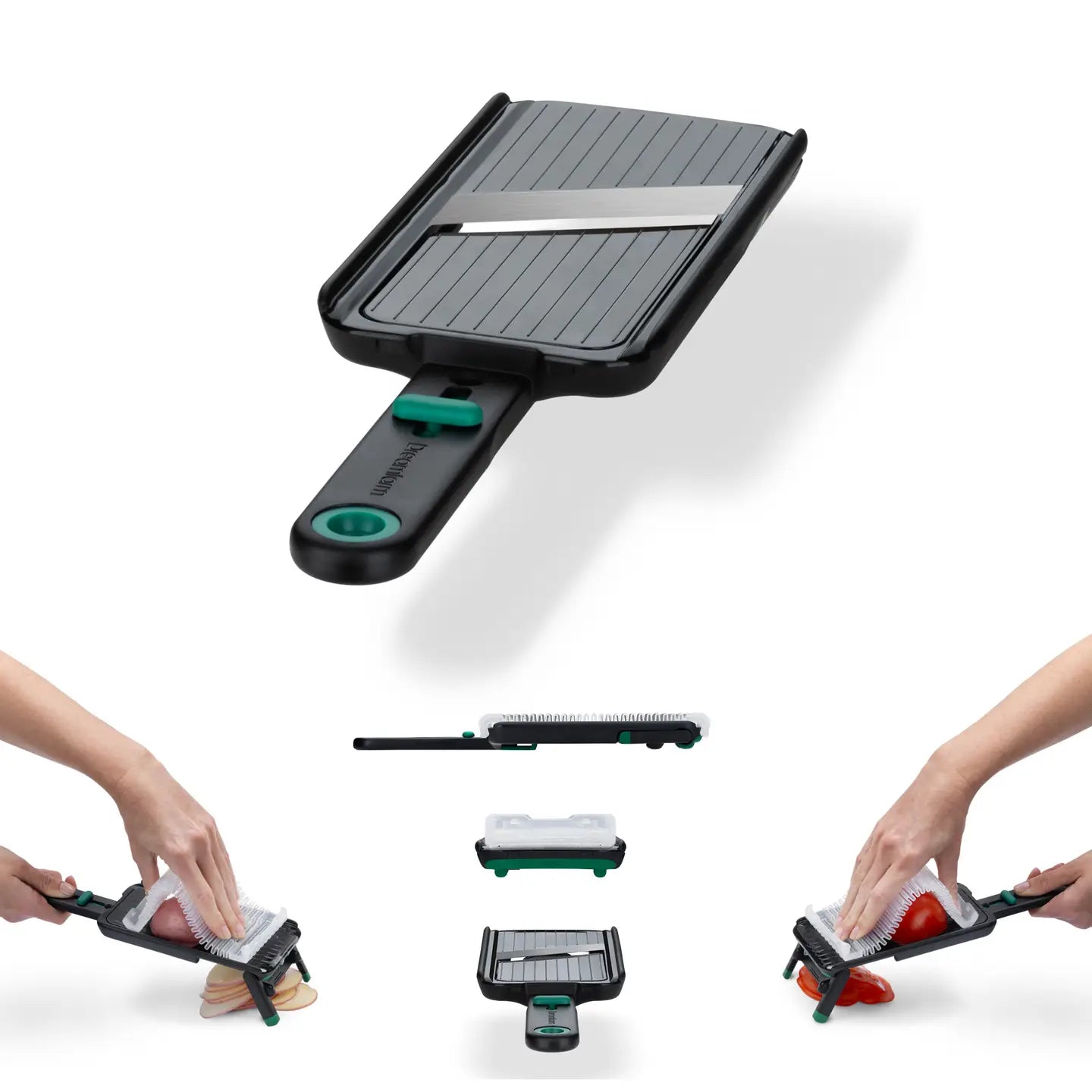 Dreamfarm Nocutu is a mandoline with a flexible finger guard that runs on tracks to safely cut right down to the last slice.