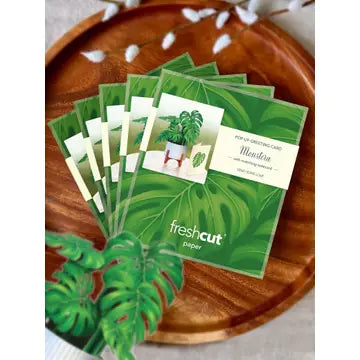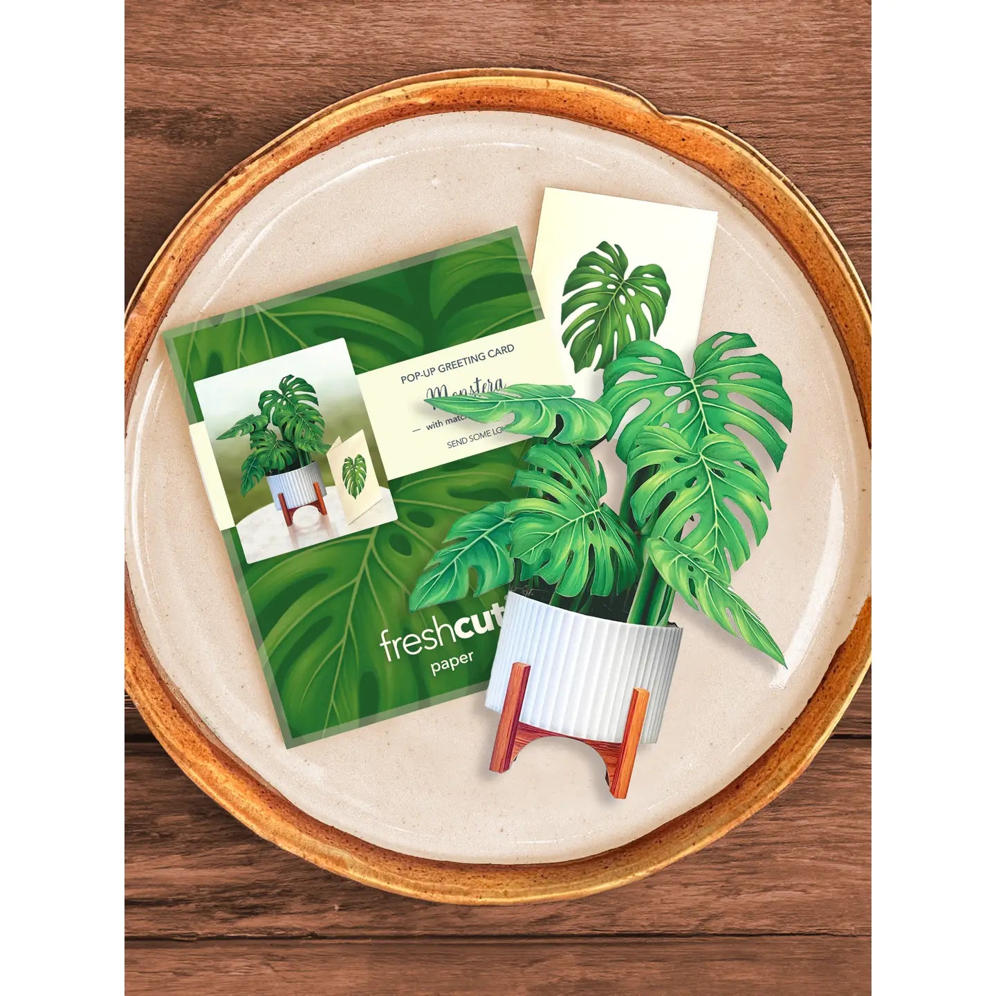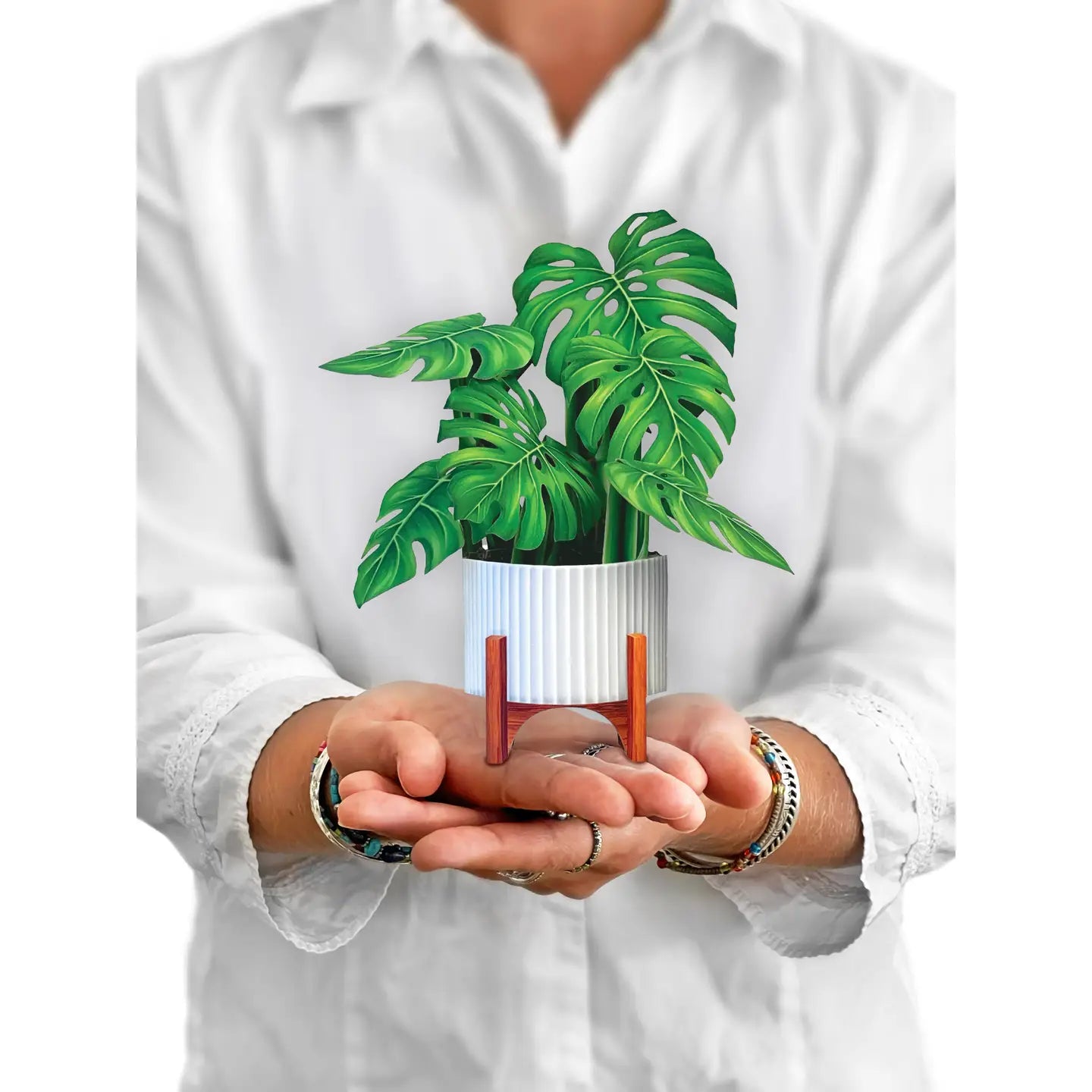Includes: pop up plant, paper base, matching note card and vibrant mailing envelope. Famously nicknamed “swiss cheese plant,” for its unique leaf shape, the Monstera has become a household favorite in the plant world. Complete with a mahogany wood stand and modern white planter, the Monstera is iconic, stunning, and effortless.