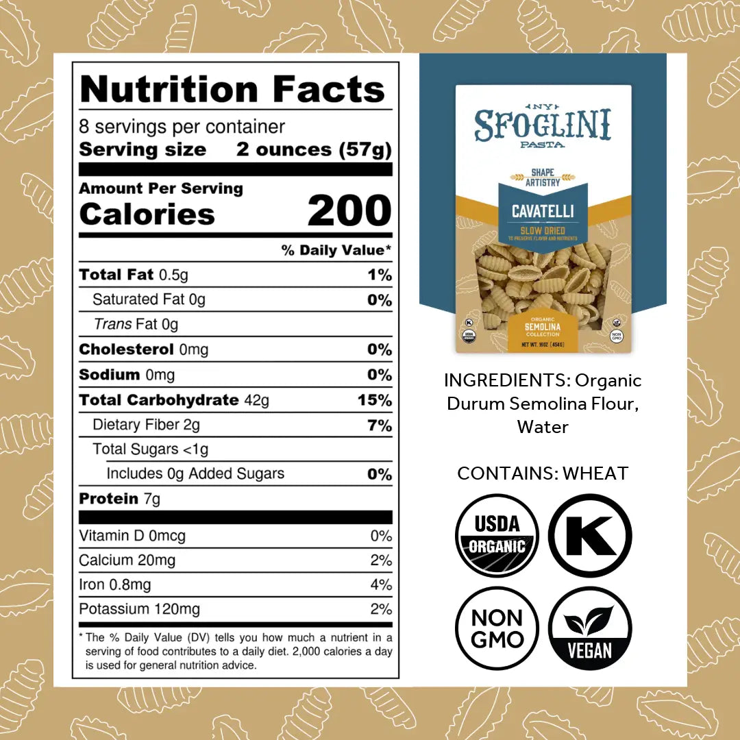 A Southern Italian Treasure Crafted for Perfect Bites. Discover a classic pasta made to the highest standards with our Sfoglini Cavatelli. A staple in Italian cuisine, Cavatelli originated in Southern Italy. Its name comes from the Italian word “cavare,” meaning “to hollow out” or “to carve.” The shape’s design, with its grooves and hollow center, makes it ideal for capturing sauces because the ridges cling to thick textures, while the hollow center traps smaller ingredients like meat or vegetables.This ensures every bite is flavorful and evenly coated. Our Cavatelli is bronze-die extruded and slow-dried, which adds a rough texture to the surface that “hugs sauce” effectively. The shape’s design, with its grooves and hollow center, makes it ideal for capturing sauces because the ridges cling to thick textures, while the hollow center traps smaller ingredients like meat or vegetables.This ensures every bite is flavorful and evenly coated.
